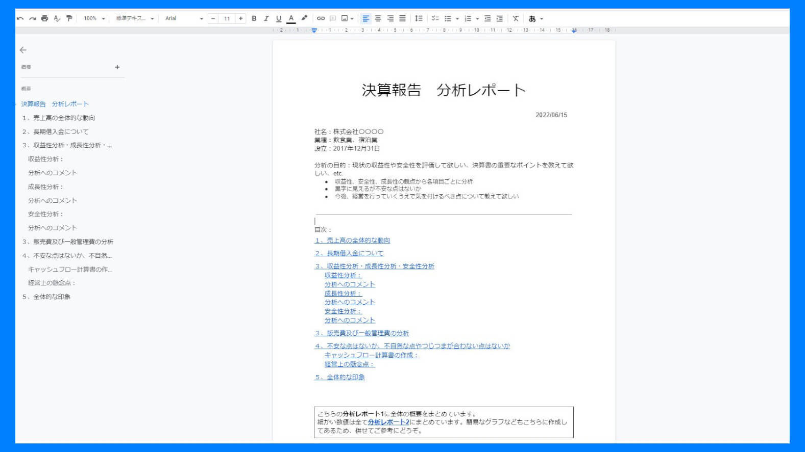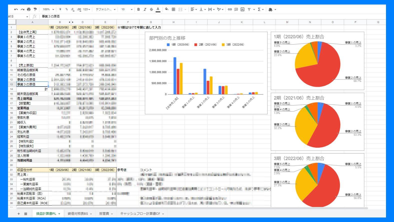 分析項目:収益性分析、安全性分析、成長性分析etc